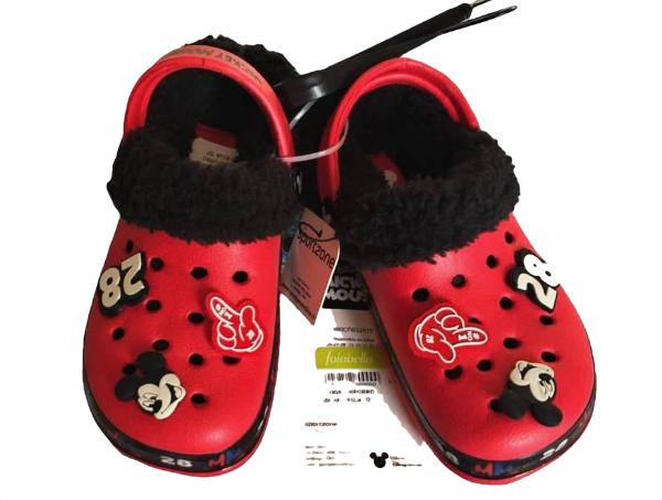 Sandalia Disney con interior forrado con chiporro sintético, liviana y resistente. Incluye pins coleccionables.
